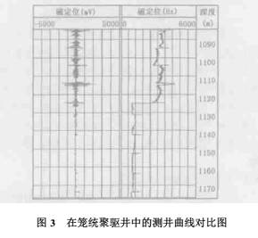 圖3是在中31- PXX籠統聚驅井中的測井曲線。測試條件是井內既有油管又有套管。在1124m以上是內徑為62mm油管段 ,以下是內徑為124.6mm的套管段,儀器居中測井。左側是原磁性定位曲線,在油管段測速是900m/h,曲線有部分干擾;在套管段測速是90m/h,接箍曲線幅度低,部分接箍不能確定其具體位置。右側是更換后的接箍曲線,測井速度 100m/h,在油管段由于管柱內徑小,曲線整體幅度高,接箍顯示清楚,1113m~1115m之間是封堵器,1124m處是油管喇叭口;在套管段由于管柱內徑大,曲線整體幅度低,接箍顯示清楚。圖中不僅清楚地顯示出油管和套管的接箍位置,而且還能通過管柱內徑的變化反映出不同的管柱結構。