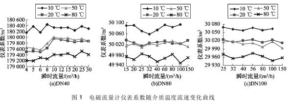 將實(shí)驗(yàn)測得的耐腐蝕排污管道流量計(jì)在不同溫度及流速下的儀表系數(shù)數(shù)據(jù)整理,特性曲線如圖1所示,3組曲線分別對(duì)應(yīng)DN40、DN80、DN100的3塊耐腐蝕排污管道流量計(jì)的儀表系數(shù)曲線。