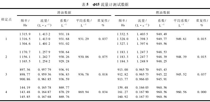 Φ15流量計測試數據如表5所示。