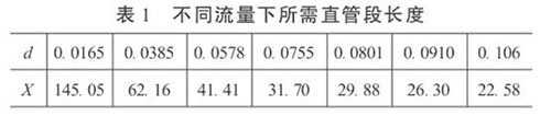 3.直管段長(zhǎng)度和生物柴油流量計(jì)精度的初步預(yù)測(cè)在工程設(shè)計(jì)中,根據(jù)流體性質(zhì)、流量和雷諾數(shù)確定α和d值。這樣,按照式(5)就可以依不同的流量計(jì)精度要求,對(duì)直管段長(zhǎng)度進(jìn)行初步預(yù)測(cè),或確定直管段長(zhǎng)度后,對(duì)流量計(jì)的精度做初步預(yù)測(cè)。當(dāng)δ= 0.2%時(shí),不同流量下所需直管段長(zhǎng)度見(jiàn)表1。