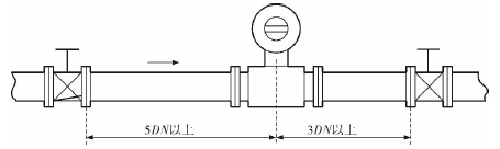 管道熱水流量計的安裝質量對其測量結果的影響較大,因此在安裝時需要注意幾個問題。*先,管道熱水流量計直管段的選擇在配管時一定要按照要求進行選擇,一般選擇流量計通徑與工藝管道通徑相同,即可滿足工程需要,而且安裝方便、壓力損失小,流量計直管段上游側的長度不少于5倍工藝管道直徑,下游側的長度不少于3倍工藝管道直徑(圖2)。但在流速太慢而又要求精度較高或需要變徑的應用場合,可選擇通徑小于工藝管道通徑的流量計,以提高測量精度,此時流量計上、下游必須加裝異徑管,且進口異徑管上游側應有長于10倍工藝管道直徑的直管段,下游側應有長于5倍工藝管道直徑的直管段(圖3)。