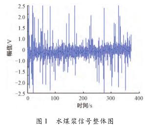 針對反應釜冷水流量計測量水煤漿時出現較大波動,甚至回零這一問題,特去某煤化工企業甲醇分公司進行現場數據采集。該公司所使用的對置式四噴嘴氣化有4個噴嘴,噴嘴管道口徑為125mm,管中水煤漿流量基本穩定在19m³/h(流速約為0.48m/s)。每條噴嘴煤漿線上安裝了3臺反應釜冷水流量計,每臺反應釜冷水流量計由傳感器和變送器兩部分組成。選擇其中1條水煤漿管線上的1臺反應釜冷水流量計進行數據采集,因為該臺反應釜冷水流量計測量結果波動大,甚至出現回零的現象。將課題組研制的基于DSP的電磁流量變送器的信號線和勵磁線接到該電磁流量傳感器的電極和勵磁線圈上,組合成完整的反應釜冷水流量計,進行水煤漿數據采集。使用的電磁流量變送器是以TI公司DSP芯片TMS320F28335為核心,采用高頻勵磁方案,其硬件主要包括勵磁控制系統和信號采集處理系統,具體的模塊有勵磁驅動模塊、信號調理采集模塊、信號處理控制模塊、人機接口模塊、通信模塊及電源管理模塊。信號調理采集模塊中的調理電路對一次儀表輸出的信號進行放大和濾波,截止頻率是2kHz,放大倍數約為230倍。通過NI公司USB-6216型號的數據采集卡進行數據采集,把調理電路的輸出端連接到數據采集卡的一個差分輸入端,并設置數據采集卡工作在差分的測量模式,設置采集卡的采樣頻率為10kHz。采集多組水煤漿信號數據,每組數據的時間長度為5min。