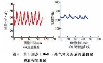 B2-××-××2井是大慶油田采油一廠1口水驅產出井,該井井口計量產液51.72m3/d,取樣化驗含水率81.8%。采用阻抗式含水率計在該井進行了測試,圖5為*1測點深度1068m測量的流量及混相值曲線圖。圖5的流量曲線表明,流量曲線受氣體影響較大,測量流量波動較大,在25~98m3/d之間波動,平均值為58.6m3/d;混相值波動也很大,在280~640Hz之間劇烈波動,平均值圖5*1測點1068m處流量曲線和混相值曲線388Hz。該井測量流量為65.8m3/d,測量含水為51.3%,受井下產氣影響明顯,測量流量明顯高于井口計量流量,測量含水率明顯低于化驗含水率。同時,在該井測井時,使用了儀器上裝有氣體分離器的阻抗式含水率計在該井進行測試,*1測點的流量及混相值曲線見圖6。由于氣體分離器將氣體分離,未進入測量通道,減小了氣體對測量傳感器的影響,測量的流量及混相值曲線波動明顯減少,流量波動為36~78m3/d,平均值為55m3/d;混相值波動為211~288Hz,平均值為228Hz。測量流量為54.8m3/d,測量含水率為80.4%,與井口計量非常接近。對比測量結果表明,氣體對流量及含水率測量造成了非常大的測量誤差,已不能進行準確測量。