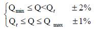 由圖2 可見,儀表系數(shù)可分為二段,即線性段和非線性段。在非線性段, 實際特性受軸承摩擦力、流體粘性阻力影響較大。當(dāng)流量低于Qmin 時,儀表系數(shù)隨著流量迅速變化。壓力損失與流量的平方成正比關(guān)系。通常線性段約為工作段的2/3,其特性與渦輪結(jié)構(gòu)參數(shù)及流體粘性有關(guān)。隨流量的變化其儀表系數(shù)K 也會有一定的變化,但變化不大,通常將其變化幅度稱為流量計的計量準(zhǔn)確度。對于產(chǎn)品設(shè)計而言,期望能將線性段的流量范圍拓展,一臺流量計能覆蓋同口徑的不同流量范圍,使得產(chǎn)品量程比變寬從而降低生產(chǎn)管理與生產(chǎn)批量加工成本。對于1.0 級的高壓機(jī)油流量計,以Qt(0.2Qmax)為分界流量點,將計量線性分為兩段,其中一段的*大允許誤差為±2%,而另一段的*大允許誤差為±1% 。按圖2 所示,通常每臺渦輪流量計均有較為相似特性曲線,若將可測量流量范圍做寬,就能在同口徑不同流量范圍進(jìn)行分段截取,以實現(xiàn)一臺流量計能覆蓋同口徑的不同流量范圍。