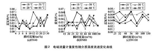 將實驗測得的水處理流量計在不同溫度及流速下的重復性數據整理,特性曲線如圖2所示,3組曲線分別對應DN40, DN80, DN100的3塊水處理流量計的重復性曲線。