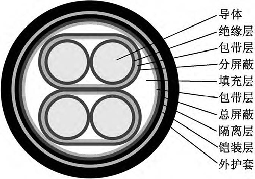 該新型電纜的結構如圖1所示。導體為單股退火鍍錫軟銅線,以提高導體的導電性和防腐蝕性。在導體外繞包一層?。疲矗ň鬯姆蚁┌雽щ妿?,有利于降低導體和絕緣之間的摩擦起電噪音。絕緣采用材料較為純凈、介電常數較小、具有一定彈性的聚丙烯絕緣級材料,并采用擠壓式擠出,減小絕緣層與導體的間隙。采用對絞組作為信號傳輸線,由于在兩根傳輸線上感應的電壓接近相等,減小了電壓差值,提高了信號傳輸穩定性;對絞組由兩種不同顏色絕緣線芯組成,相鄰線對對絞節距應不大于100mm。對絞分屏蔽組(即對對絞組進行分屏蔽,每對對絞組外繞包兩層聚酯帶和一層厚0.04mm鋁塑復合帶繞包,內置一根7×0.26mm鍍錫銅絞線作引流線)有利于對不同對絞組之間信號串音的抑制和隔離。對絞分屏蔽組同心式絞合成纜,在對絞分屏蔽組間填充非吸濕性材料,以保證纜芯圓整。在成纜纜芯外繞包兩層聚酯帶,再采用鋁塑復合帶繞包,內置鍍錫銅線作引流線,以提高電纜電磁屏蔽能力。總屏蔽層外擠包隔離層(隔離護套),隔離層采用絕緣級低密度聚乙烯材料。隔離層外采用鎧裝層,鎧裝材料為高導磁合金鋼帶,其為強磁材料,可將外來的磁通大部分限制在鎧裝層的外表面上(僅有少部分能進入被屏蔽的空間);鎧裝時對高導磁合金鋼帶采用縱包焊接,確保其形成一連續圓柱管;鎧裝層可提高電纜抗電磁干擾水平以及對電纜進行加強,減少電纜振動引起的電動勢。外護套采用藍色軟PVC(聚氯乙烯)護層級電纜材料擠包,實現電纜防護。