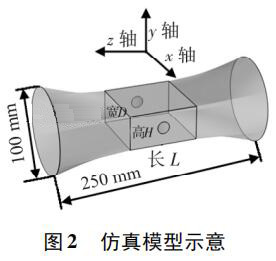 使用 Pro /E 軟件建立三維幾何模型,導入 COMSOL 軟件進行有限元求解。仿真模型如圖 2 所示,電極連線為x 軸,連線中點為坐標原點,流體運動方向為 z 軸,傳感器管道口徑為 DN100,總長250 mm。異徑管部分初始結構尺寸 L = 80 mm,D = 80 mm,H = 40 mm,圓形電極半徑為17 mm,伸出絕緣襯里的*大距離為 1. 5 mm。