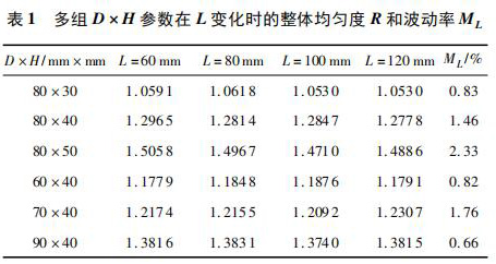 計算多組相同 D × H、不同 L 時 xy 平面的權函數整體均勻度 R 及波動率 ML,如表 1 所示。