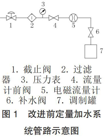 其工作過程為:當(dāng)設(shè)定好加水量后,啟動系統(tǒng)往調(diào)制罐 7 內(nèi)定量加水,流量計前閥 4 開啟對管路進(jìn)行預(yù)填充,延時一定時間后,調(diào)制罐補水球閥 6 開啟,同時管道電磁流量計開始計量,當(dāng)管道電磁流量計的累積量與設(shè)定加水量一致時,球閥 4 和 6 關(guān)閉,定量加水過程完成。在設(shè)備使用的過程中,發(fā)現(xiàn)定量加水系統(tǒng)存在以下問題: