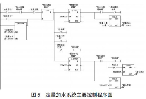 定量加水系統(tǒng)的工作過程為:當(dāng)設(shè)定好加水量后,啟動系統(tǒng),多級離心泵 10、回流閥 4、出水閥 9 和流量計前閥 12開啟對管路進(jìn)行預(yù)填充;延時 30s 預(yù)填充完成后,回流閥 4關(guān)閉,調(diào)制罐補水閥 14 開啟,同時質(zhì)量流量計 13 開始計量;當(dāng)質(zhì)量流量計的累積量與設(shè)定加水量一致時,出水閥 9 和調(diào)制罐補水閥 14 關(guān)閉;調(diào)制罐定量加水完成后,開啟回收閥17 和回流閥 4 以及同未關(guān)閉流量計前閥 12 一起,利用壓縮空氣對管道中水實現(xiàn)回收;延時 30s 水回收完成后,關(guān)閉多級離心泵、球閥 4、12 和 17,定量加水過程完成。定量加水系統(tǒng)主要控制程序如圖 5 所示。