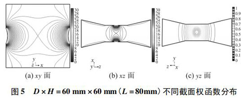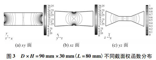 4) 圖 3( c) 、圖 4( c) 的 yz 面權函數(shù)分布表明,D = 90 mm時的權函數(shù)等勢線間距略大于 D = 60 mm 時的權函數(shù)等勢線間距,權函數(shù)變化梯度較小,且中心區(qū)域的權函數(shù)等勢線逐漸變?yōu)橹本€,因此 D = 90 mm 的權函數(shù)分布更均勻一些,但是兩者區(qū)別很小,即寬度改變對 yz 面權函數(shù)分布影響很小。圖 4( c) 、圖 5( c) 的 yz 面權函數(shù)分布表明,H = 30 mm時的權函數(shù)等勢線間距較大,且中心區(qū)域的權函數(shù)等勢線逐漸變?yōu)橹本€,因此 H = 30 mm 的權函數(shù)分布更加均勻;