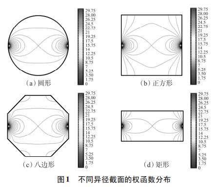 為考察不同異徑截面權函數(shù)分布的均勻性,使用上述方法對圓形、正方形、八邊形和矩形異徑截面的權函數(shù)分布進行定性分析。為了便于對比,設置管道口徑為DN100,異徑部分截面積為3200mm2。所以,圓形異徑面半徑為32mm,正方形異徑面邊長為56.6mm,八邊形異徑面邊長為25.8mm,矩形異徑面長寬為80×40mm。仿真結果如圖1所示,為了便于對比,權函數(shù)等勢線大小從0開始,以0.25為步長遞增到30。由圖1(a)~圖1(d)可知,矩形異徑截面的權函數(shù)等勢線間距*大,即權函數(shù)變化梯度*小,權函數(shù)分布*均勻。