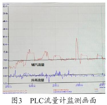 通過圖3可以看出,PLC 上輔汽測(cè)量用的沼氣流量計(jì)的量程設(shè)置為30t/h,現(xiàn)場(chǎng)設(shè)備量程實(shí)際為5t/h,兩者嚴(yán)重不符,因此測(cè)量值8.286t/h 為錯(cuò)誤值,需要對(duì)程序進(jìn)行修改。