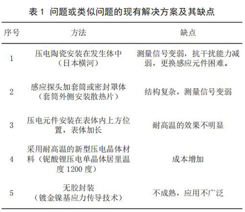 3) 當(dāng)前技術(shù)系統(tǒng)存在的問(wèn)題。 由于目前使用的傳感器檢測(cè)感應(yīng)元件為壓電陶瓷,其極化時(shí)居里溫度大約420 ~ 460℃,因此只能在低于 240℃介質(zhì)中使用,一旦被測(cè)量介質(zhì)的溫度高于 240℃,煤氣流量計(jì)傳感器便會(huì)因壓電陶瓷達(dá)到居里點(diǎn),絕緣電阻降低,壓電信號(hào)變?nèi)醵А?br /> 4)問(wèn)題或類似問(wèn)題的現(xiàn)有解決方案及其缺點(diǎn)(見(jiàn)表 1)。