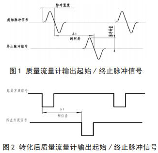 將高壓電磁流量計(jì)流量與相關(guān)測(cè)試設(shè)備連接起來(lái),就可以進(jìn)行高壓電磁流量計(jì)的校準(zhǔn),時(shí)間差△ t 由專(zhuān)用試驗(yàn)測(cè)試設(shè)備可以測(cè)出。起始脈沖信號(hào)和終止脈沖信號(hào)如圖 1 所示。經(jīng)過(guò)專(zhuān)用試驗(yàn)測(cè)試設(shè)備信號(hào)轉(zhuǎn)化后的信號(hào)方波如圖 2 所示。