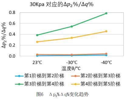 為了更直觀嚴謹的對比每個階段響應速度的不同,對原始數據進行處理,得到如下表格2和表格3。將△p2%/△q%作為響應速度的直觀量化表達,若△p2%/△q%的值大,說明單位流量變化照成的出口壓力變化大,即說明高溫液體流量計響應相對較慢,反之亦然。