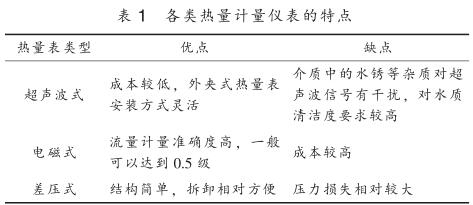 目前供熱行業(yè)內(nèi)使用的熱量計量儀表按工作原理主要分為超聲波式、 電磁式、 差壓式, 其特點見表 1 。 熱量計量儀表按結(jié)構(gòu)可分為一體式和分體式, 一體式熱量表將一支入口或出口溫度傳感器嵌入到流量傳感器管道中, 并配有專門的計算器進(jìn)行熱量計算; 分體式熱量表采用單獨的流量傳感器, 包括超聲波流量計、 電磁流量計、 差壓流量計、瀝青流量計等, 溫度測量采用單獨的鉑電阻溫度計或溫度變送器測量供回水管道溫度, 再配備熱量積算儀進(jìn)行溫度和流量信號采集得到熱量值。