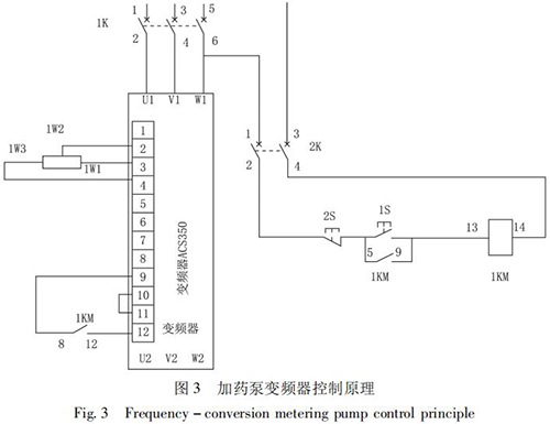 STD - Ⅲ型浮選工藝參數(shù)自動(dòng)測控系統(tǒng)通過雙膜盒差壓計(jì)測量原礦漿濃度; 采用管道式流量計(jì)測量原礦漿流量,由 PLC 計(jì)算出入浮干煤泥量和藥劑的瞬時(shí)添加量,用變頻式計(jì)量泵完成浮選藥劑的添加。通過上位機(jī)還可以打印小時(shí)、班、天及月的運(yùn)行數(shù)據(jù),更加有利于生產(chǎn)管理及技術(shù)分析,藥劑自動(dòng)原理如圖 2 所示,k1、k2、k3 是計(jì)算修正參數(shù)。以 PID 算法為核心,通過優(yōu)化控制程序計(jì)算出藥劑給定量,在捕收劑和起泡劑管道上分別安裝藥劑測量裝置,用于檢測藥劑的添加量。當(dāng)藥劑測量值小于藥劑給定量時(shí),PID 輸出增大,反之則減小。加藥泵變頻器控制原理如圖 3 所示。