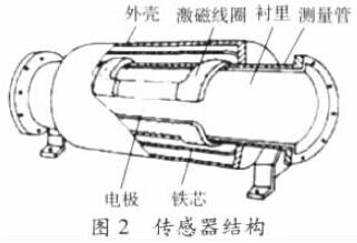 電磁流量計由流量傳感器和轉(zhuǎn)換器兩部分組成。傳感器典型結(jié)構(gòu)示意如圖2,測量管上下裝有激磁線圈,通激磁電流后產(chǎn)生磁場穿過測量管,一對電極裝在測量管內(nèi)壁與液體相接觸,引出感應(yīng)電勢,送到轉(zhuǎn)換器。激磁電流則由轉(zhuǎn)換器提供。
