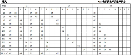以上表值僅供參考,實(shí)際使用中因液體粘度和氣體密度不同應(yīng)在此值附近調(diào)整,頻率低時可將 K3 向大口徑方向調(diào)一至三檔。頻率高時可將 K2 向小口徑方向調(diào)一至三檔。
