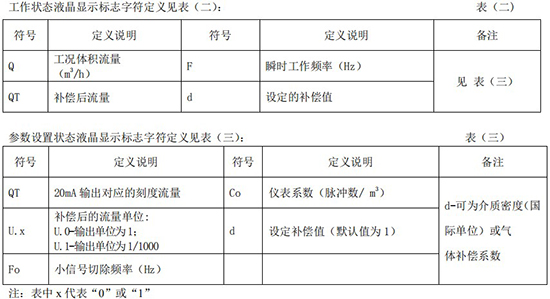 (3)標(biāo)況流量計(jì)算公式(若補(bǔ)償后單位為 U.0):(4)標(biāo)況流量計(jì)算公式(若補(bǔ)償后單位為 U.1):注:標(biāo)況指 20℃,1 標(biāo)準(zhǔn)大氣壓三、一體化液晶顯示表頭參數(shù)設(shè)置操作說明(V03Z)1、鍵盤按鍵說明2、 顯示窗字符說明注:表中 x 代表“0”或“1”;Zn:標(biāo)準(zhǔn)狀態(tài)下(20℃,1 標(biāo)準(zhǔn)大氣壓),被測氣體的壓縮系數(shù),Z:工作狀態(tài)下被測氣體的壓縮系數(shù)3、 操作說明3.1、本儀表表頭采用自導(dǎo)引式和菜單式相結(jié)合的參數(shù)設(shè)置方式,所謂自導(dǎo)引式參數(shù)設(shè)置方式就是用戶在進(jìn)入菜單 00 項(xiàng)后,表頭中的微電腦會(huì)自動(dòng)導(dǎo)引用戶去設(shè)置需要設(shè)置的參數(shù)。另外,用戶也可以通過菜單模式分別對(duì)各組參數(shù)進(jìn)行設(shè)置。蒸汽測量菜單框圖如下:3.2、參數(shù)設(shè)置約定:在設(shè)置各項(xiàng)參數(shù)時(shí),提示符閃動(dòng)代表該項(xiàng)參數(shù)沒有設(shè)置完或者尚未確認(rèn),可以通過按SET 鍵來確認(rèn)或者按→鍵退出;提示符不閃動(dòng)代表該項(xiàng)參數(shù)已設(shè)置完并確認(rèn),此時(shí)可以通過按 SET 鍵翻頁或者按→鍵退出。進(jìn)入?yún)?shù)設(shè)置時(shí),需要輸入密碼(6 位)并確認(rèn)進(jìn)入,為了防止誤進(jìn)入?yún)?shù)設(shè)置菜單,保證儀表正常工作,在設(shè)置密碼時(shí),使用↑鍵調(diào)數(shù)時(shí)不能循環(huán)調(diào)數(shù),只能單次調(diào)數(shù),只有密碼輸入正確進(jìn)入各項(xiàng)參數(shù)設(shè)置菜單后才可以對(duì)各位循環(huán)連續(xù)調(diào)整數(shù)據(jù)。3.3、儀表參數(shù)設(shè)置舉例:儀表出廠前各項(xiàng)參數(shù)已設(shè)置好,用戶無需設(shè)置。如果用戶需要設(shè)置某項(xiàng)參數(shù),請(qǐng)參照以下步驟,例如修改刻度流量值 QT:在工作狀態(tài)下,按 SET 鍵,顯示屏顯示 P,數(shù)字位為全零,8 秒鐘若無操作,自動(dòng)返回工作狀態(tài)。輸入密碼 :按數(shù)字↑鍵和左移←鍵,輸入密碼數(shù) xxxxx(出廠時(shí)默認(rèn)密碼為 000123),↑鍵調(diào)各位數(shù)字 0-9,每按 ←鍵一次數(shù)字向右循環(huán)一位,可通過多次按←鍵對(duì)整段數(shù)字清零,按→鍵可以返回工作狀態(tài)。菜單選擇項(xiàng):按 SET 鍵確認(rèn),顯示屏顯示如右圖所示,末行“00”閃動(dòng)調(diào)整該項(xiàng)值選擇不同參數(shù)設(shè)置菜單。該例直接按 SET 鍵進(jìn)入菜單 00 項(xiàng)設(shè)置刻度流量:QT 閃動(dòng),*一步:*先進(jìn)行小數(shù)點(diǎn)調(diào)整,可以通過←鍵對(duì)參數(shù)快速清零或者通過↑鍵進(jìn)行小數(shù)點(diǎn)調(diào)整,調(diào)整完畢,按 SET 鍵確認(rèn)(QT 仍閃動(dòng));*二步:數(shù)值調(diào)整,可以通過↑鍵對(duì)每位數(shù)字進(jìn)行調(diào)整,按 ←鍵一次數(shù)字向右移動(dòng)一位,調(diào)整完畢,按 SET 鍵確認(rèn),QT 停止閃動(dòng),該項(xiàng)參數(shù)設(shè)置完畢,可進(jìn)行下一項(xiàng)參數(shù)設(shè)置或者退出另外,單位設(shè)置 U.X 和補(bǔ)償方式設(shè)置 dX 通過↑鍵調(diào)整修改。3.4、校驗(yàn)項(xiàng)說明: 儀表出廠前,溫度和壓力通道已校驗(yàn)設(shè)置好,無需用戶重新校驗(yàn)。校驗(yàn)通道有密碼保護(hù),廠家不對(duì)外開放,如果需要重新校驗(yàn)溫度或者壓力通道,請(qǐng)專業(yè)人員與廠家技術(shù)人員聯(lián)系。4、計(jì)算公式說明4.1、蒸汽測量計(jì)算公式(1)渦街流量儀表工況體積流量計(jì)算公式:(2)密度 d,單位 Kg/m3(3)質(zhì)量流量計(jì)算公式,單位 Kg/h:(4)質(zhì)量流量計(jì)算公式,單位 t/h:4.2、氣體測量計(jì)算公式----標(biāo)況指 20℃,1 標(biāo)準(zhǔn)大氣壓(1)渦街流量儀表工況體積流量計(jì)算公式:(2)對(duì)比壓縮系數(shù) d(Zn/Z),單位 1(3)標(biāo)況流量計(jì)算公式,單位 Nm3/h:P1—工況絕壓,PN—標(biāo)況絕壓(Mpa),T1—工況熱力學(xué)溫度,TN—標(biāo)況熱力學(xué)溫度(K)