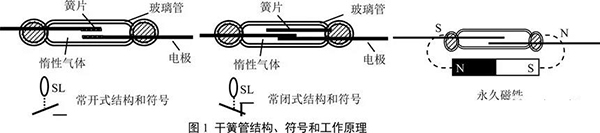 干簧管開(kāi)關(guān):由一組或幾組導(dǎo)磁金屬簧片封裝在充有惰性氣體的玻璃管中組成的元件,每組簧片既能導(dǎo)磁又能導(dǎo)電,起開(kāi)關(guān)電路和磁路的雙重作用,如圖1。對(duì)于常開(kāi)型:當(dāng)干簧管在外加永久磁場(chǎng)或電磁場(chǎng)的作用時(shí),干簧管中的兩根簧片分別被磁化,在兩根簧片接近的地方產(chǎn)生異性磁極而吸引,兩根簧片相接觸使電路導(dǎo)通。反過(guò)來(lái),當(dāng)磁場(chǎng)取消時(shí),簧片依靠本身的彈性力恢復(fù)原狀,兩簧片分離,電路斷開(kāi),這樣便完成了一個(gè)開(kāi)關(guān)的作用。常閉型干簧管原理可自行分析。干簧開(kāi)關(guān)有許多優(yōu)點(diǎn):由于接點(diǎn)密閉在充滿惰性氣體的玻璃管中,不易腐蝕、氧化和污染,接點(diǎn)免于維護(hù);接通或釋放的時(shí)間只有1~3毫秒,僅為電磁繼電器的1/5~1/10,可以作為速動(dòng)開(kāi)關(guān)使用;由于接點(diǎn)部分使用了金、鐒、鈀合金鍍層,壽命長(zhǎng),開(kāi)關(guān)約為106~107次。