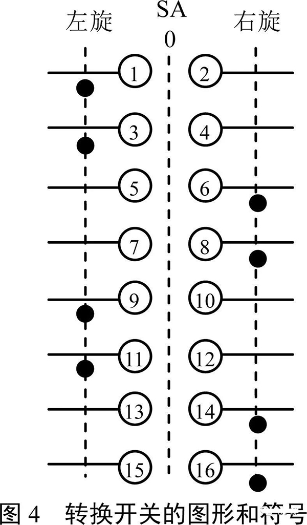 圖4是一款轉(zhuǎn)換開(kāi)關(guān)的圖形和符號(hào),表1是它在左旋和右旋兩個(gè)部位時(shí)8個(gè)開(kāi)關(guān)對(duì)應(yīng)的通斷情況。