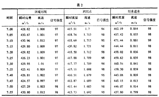 下面是隨機(jī)地從計(jì)算機(jī)中抽取的某一日的幾組數(shù)據(jù)(表2)。從表中可以看出采用超聲波流量計(jì)側(cè)量數(shù)據(jù)精確度較高,讀取數(shù)據(jù)方便,從信號(hào)強(qiáng)度上可以看出,在測(cè)量回流污泥時(shí),信號(hào)強(qiáng)度較低,這是由于液體濁度較高,含有較大固體顆粒引起信號(hào)衰減造成的。