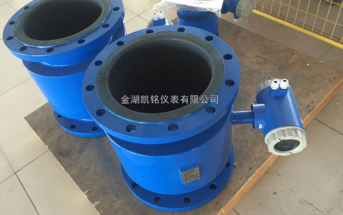 凱銘電磁流量計是以內襯絕緣材料做為非導磁合金短管;兩只電極沿管徑方向穿通壁固定在測量管上,其電極頭與襯里內表面基本齊平。勵磁線圈由雙向方波脈沖勱磁時,將在與測量管軸線垂直的方向上產生一磁通量密度為B的工作磁場;此時,如果具有一定電導率的液體流經測量管,將切割磁力線感應出電動勢E,電動勢E正比于磁通量密度B,測量管內徑d與平均流速V 的乘積。電動勢E(流量信號)由電極檢出并通過電纜送至轉換器。轉換器將流量信號放大處理后,可顯示流體流量,并能輸出脈沖,摸擬電流等信號,用于流量的控制和調節。